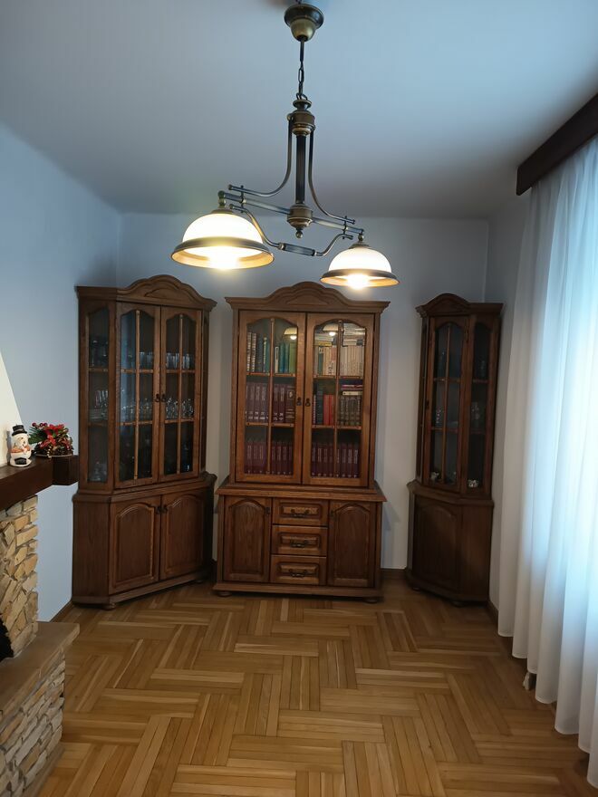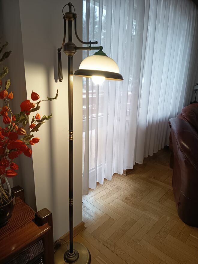 Oświetlenie stylowe do salonu w komplecie: lampy mosiężne wiszące, na 3 i 2 żarówki, lampa stojąca o wysokości 167 cm; lampa biurowa o wysokości 65 cm. w cenie 2800 zł.Oświetlenie stylowe do pokoju - komplet: lampa wisząca i kinkiet 800 zł.