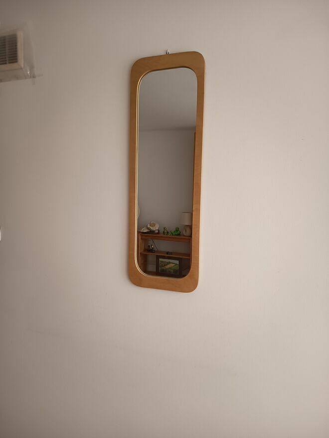 Komplet regałów z drzewa sosnowego oraz lustro. 1630 zł